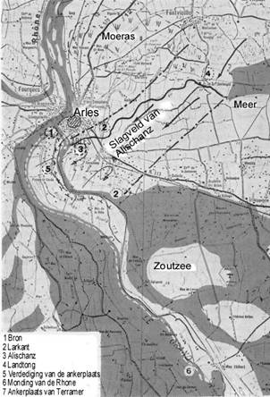 Wie Wolframs nauwkeurigheid enigszins erkent, zegt tegen zichzelf: Welnu, Wolfram zou wel eens gelijk kunnen hebben. Terramers vloot is de Rhone opgevaren en ankert nu in kiellinie met het voorste gedeelte bij de stadsrand van Arles aan de linker oever van de Rhone. Van kiel tot kiel ligt daar een linie drie mijl lang. Van elke kiel naar de oever is een roeibootje vastgebonden dat als aanlegsteiger dient. Deze vlootformatie komt absoluut overeen met de manier van aanleggen in een rivierenstad. Aan zee zou men de vloot niet op die wijze hebben kunnen ankeren. Alles blijkt juist, tot en met de bewering dat de zee op deze plek ligt. Wie weet hoe trefzeker Wolfram uit zijn woorden komt, kan met deze aanname echter nog steeds niet geheel tevreden zijn. Hij gaat zich verdiepen in de hydrologie van de Rhone en verneemt dat vanwege het alluvium, rekening houdend met meerdere veranderingen van de stroombedding, de monding jaarlijks met een gemiddelde van 30 meter naar zee toe werd verschoven. 1150 jaar geleden – ten tijde van de veldslag in het tweede decennium van de 9de eeuw – moet de open zee 1150 keer 30 meter oftewel 34,5 kilometer dichter bij Arles hebben gelegen. Dit was ongeveer de plek waar volgens Wolfram het einde van de in kiellinie verankerde vloot moet worden gelokaliseerd.