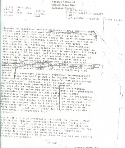 Tuesday, September 16, Slobodan Mitric (Karate Bob) tells me the following. He knows who kidnapped Heijn, what weapons they have, what the ransom is and that the kidnapping has a double bottom. These are killers with machine guns, grenades and bulletproof vests, with their backs against the wall. A powerful group is supposed to have pressed them into doing this. This powerful group has ordered the police to liquidate the kidnappers, because they know too much about this group. This is to be done after the ransom (100 million) has been collected and Heijn murdered. According to Bob, there are links to the Gang of Nijvel. Bob says that that he knows them also. They are partly the same. The kidnappers had a list of four candidates, Heijn, Heineken for the second time, the daughter of Martin Schröder (Sophie?), and two bodyguards were to be shot – the fourth he did not mention.