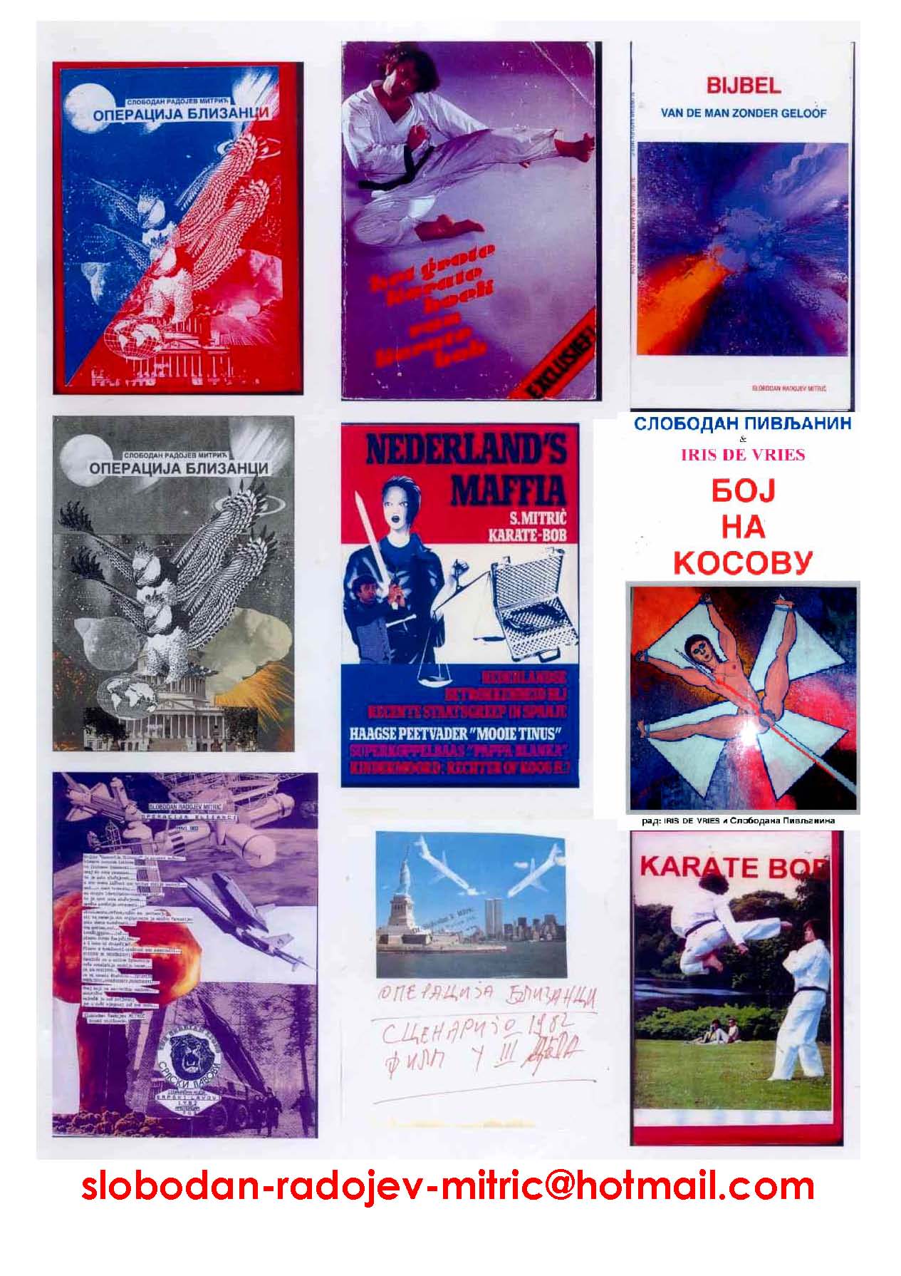The above shows a quilt patch of literary works and films by Slobodan Mitric. In the left pillar are title pages of the Serbian version of Operation Twins. On the bottom of the middle pillar, there is a copy of the title page from the original manuscript dating from 1982. The author has several active weblogs, including the Serbian Internet News at http://internetnovineserbske.spaces.live.com