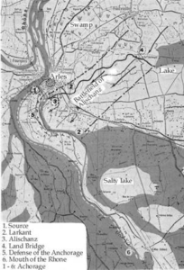 Whether this is exactly right can of course only be established by examining the actual geological circumstances. For the time being, the rule of thumb of the average yearly deposit may suffice in order to arrive at the assumption that Wolfram’s reference could in principle be right: Terramer anchored in the mouth of the Rhone. At the place where the Rhone used to flow into the Mediterranean Sea, Terramer anchored his ships in river traffic formation from keel to keel. The Larkant canal that ran parallel to the Rhone formed a natural barrier behind which Terramer set up position and defended the anchorage (Plate 12).